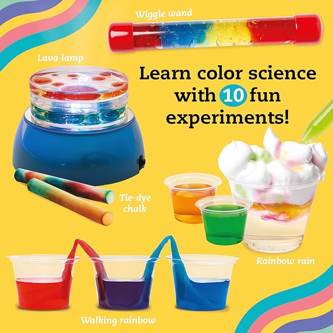 - Includes 10 activities, featuring tie-dye chalk, color wand, and rainbow rain