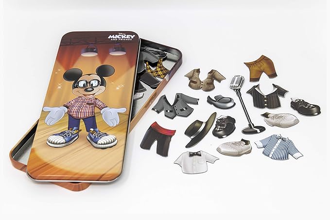 - INCLUDES: Double-sided magnetic tin for decorating and storing dress-up pieces, and 23 mix-and-match magnetic pieces