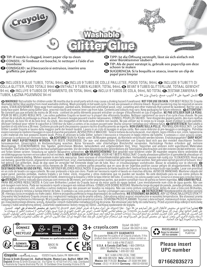 - Includes nine 35 fl. oz. Glitter-glue tubes