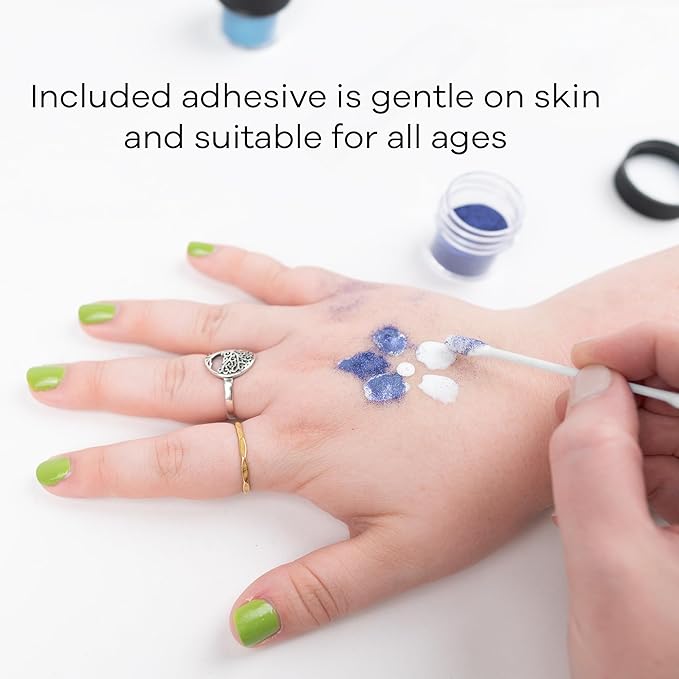 - Safe to Use - The included glitter tattoo glue is gentle on skin and suitable for all ages. We recommend testing a small section of skin and waiting 24hours for any reaction before applying a full design. The glitter is fine and won't scratch or irritate the skin