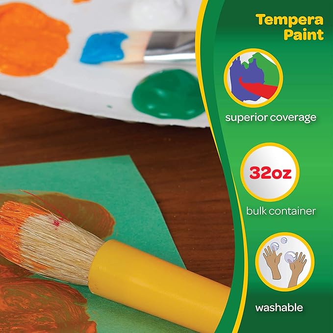 - ARTS & CRAFTS: Crayola Tempera Paint provides ultimate opacity and coverage. The creamy consistency dries to a matte finish that won’t crack or flake. Tempera works on many absorbent surfaces like construction paper, cardboard and papier-mâché.