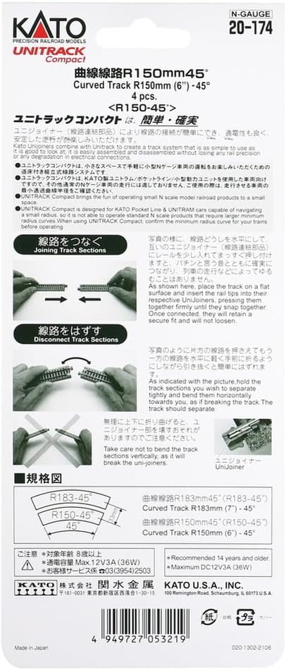 Kato USA Model Train Products UNITRACK Compact Tracks (4-Piece), 150mm/(6") Radius/45-Degree