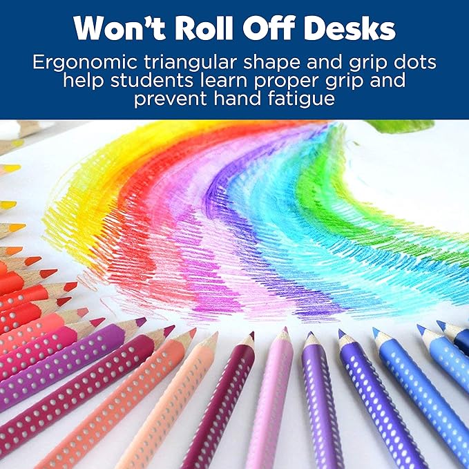 - An art educator favorite - triangular in shape and grip dots, These pencils will not roll off the desk and help students learn proper grip while having better control when coloring.