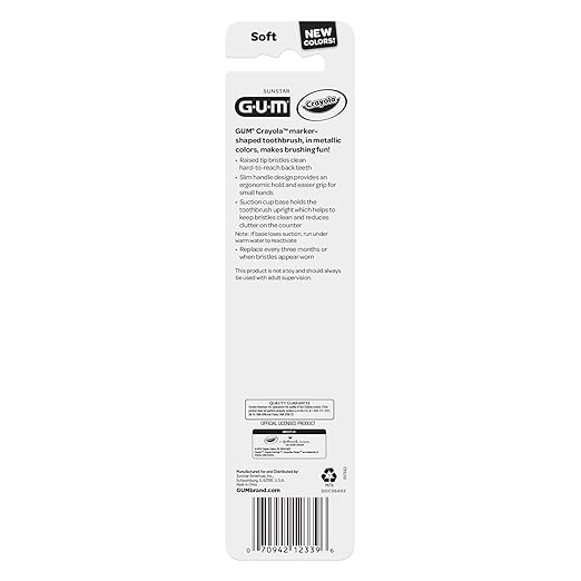 GUM Crayola Marker Children’s Toothbrush, Soft Bristled Kids’ Toothbrush Set Age 3+, Suction Cup Base, 2ct