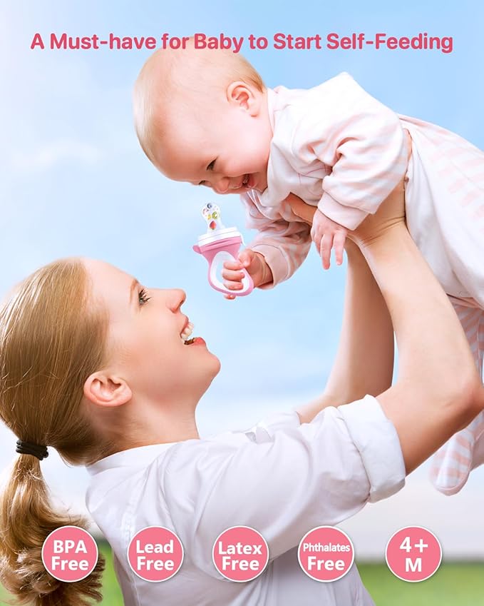 - Safely Introduce Solids & Helps Teething Relief: Our baby feeder designed with small holes that only small pieces of digestible food get through, helps reduce the risk of choking and encourages self-feeding. Fill it with frozen fruits, breastmilk, it can function as a baby fruit teether toy that soothe teething pain. Compared to all silicone feeders, it is lighter in weight and more easily for little hands to hold