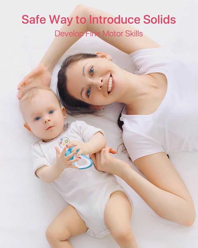 - Complete Baby Feeding Set for First Stage: It's a comprehensive one-stop solution, equipped with everything required to support your baby's feeding and teething journey. Each set includes 4 soft silicone baby spoons that are gentle on delicate gums, 2 baby fruit feeder and teethers that offer a safe way to introduce solid food, it's also a smarter alternative to a regular baby teething toy for teething relief. A masher and serve bowl make you easily and quickly mash up fruits and veggies. Perfect Baby Shower Gift Idea