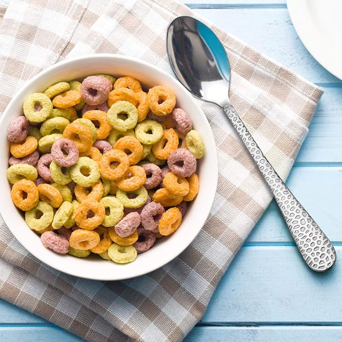 - PERFECT SIZE- Customized mini size to fit toddler’s hand and mouth, Hammered pattern gives a shiny glow to catch toddlers’ attention, Proper thin fork tines make it easy for kids fork soft food by themselves, suggest for 24 months +