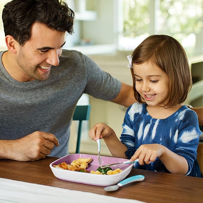 - Colorful toddler-sized BPA free utensil sets include two forks, two knives and two spoons