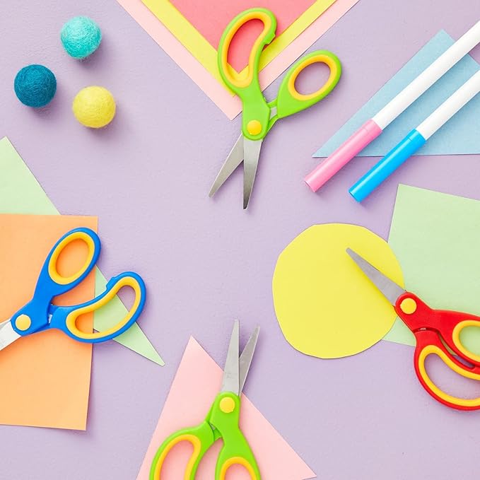 - Kids Scissors Bulk Pack: These 24 small curved-tip scissors come in vibrant blue, green, and red (8 of each color). Children can enjoy interactive play while safely cutting out images, creating puppets, or constructing simple paper crafts, fostering imaginative play and creativity