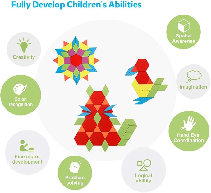 - Fun Educational Toy: Wooden pattern blocks made of high-quality wood with harmless water paint. Wooden shapes feel smooth in hands with beautiful and bright color. Perfect for improving special reasoning for math and fine motor skills! A fun little activity for the family to work on together, building a harmonious parent-child relationship