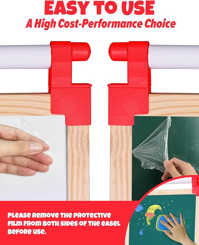 - 【DOUBLE SIDE PAINTING】 -- This kids easels for toddlers comes with a red tray which can put accessories you want. It's double-sided with magnetic green board on one side, chalk board on the other which has a clips for clipping papers of various sizes. Both sides of Toddler Art Easel for Toddlers 2-4 years and Art Easel for Kids Ages 4-8, experience a variety of painting pleasure.