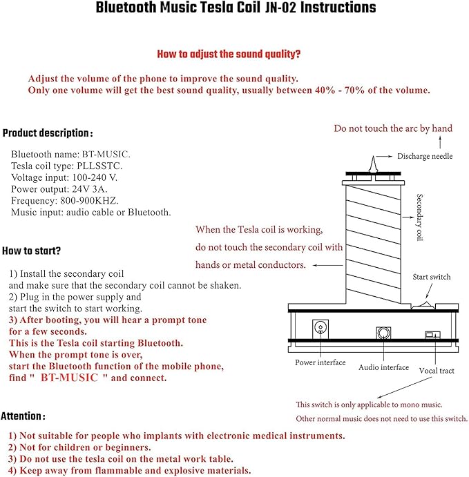 - How to play music? ★★★★★ The device can play music via Bluetooth or audio cable. Start the Tesla coil. When the prompt tone is over, the Bluetooth connection can be successfully searched. If you use an audio cable, you can connect it directly. How to adjust the sound quality? ★★★★★ You need to control the volume of your phone to adjust the sound quality. The best sound quality is usually between 40% and 70% of the volume of the device.
