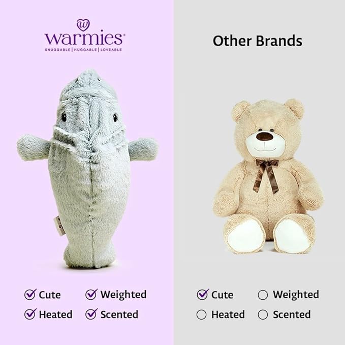 - Warmies Microwavable Stuffed Animal: Manatee is a snuggable, huggable, lovable weighted plush toy for all ages that can be easily heated to provide hours of soothing warmth and calming comfort, or chilled to provide cooling relief. 13 inches tall. 2 lbs.