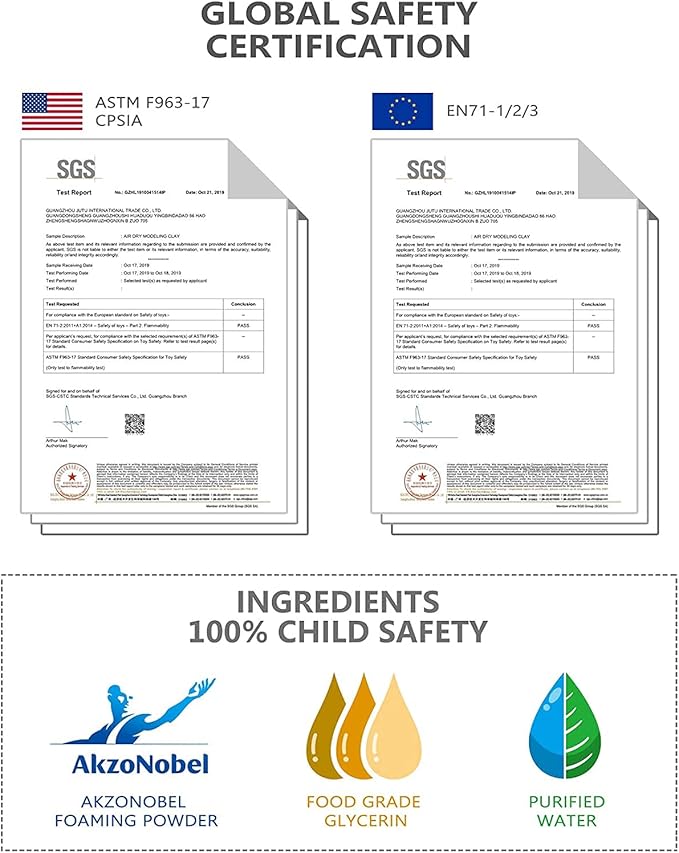 - NON TOXIC & SAFE - Have passed ASTM F963-17, CPSIA & EN71 certification. Wheat, tree nut or peanut-free. Kid-friendly and parent approved air dry clay for kids! Kids gifts ideas as toys for boys, toys for girls.