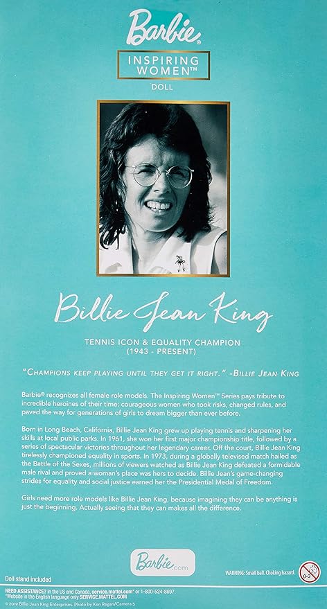 - Billie Jean King Barbie doll wears a two-tone blue and mint-green tennis dress inspired by what she wore during her legendary match. Blue tennis shoes, a Wilson racket and ball complete her look.