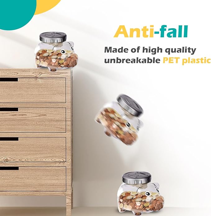 - Creative design,The coin box is made of high-quality and not easy to break PET plastic (transparent). If the coin has been taken away or you want to drop it, there is a simple +/- function that allows you to report the withdrawn amount and record your savings correctly!
