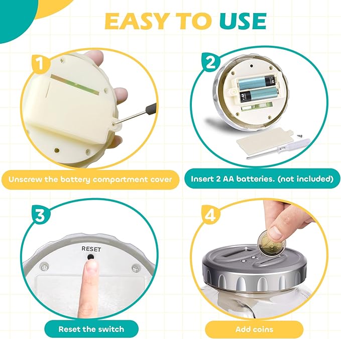 - Clear LCD screen,Piggy bank accepts all US coins including: Pennies, nickels, dimes, quarters, half dollars and dollar coins.The clear LCD screen counts your coins and shows the total amount for every deposit exactly. Powered by a 2 * AA battery (not included).
