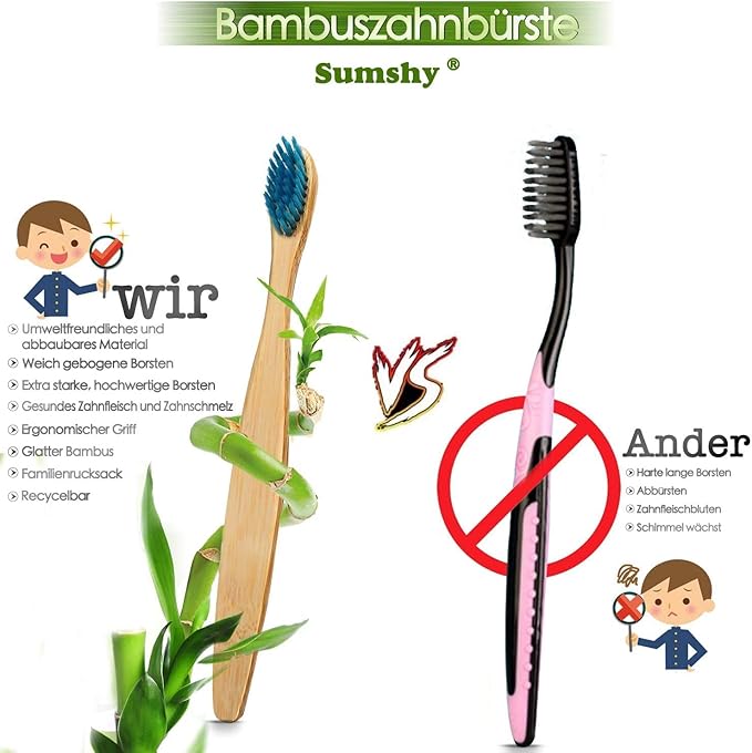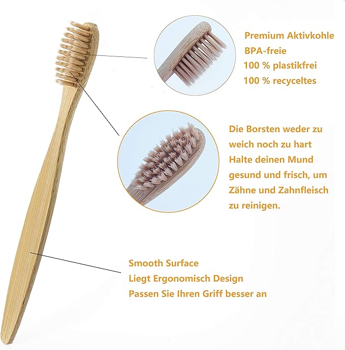 - SMOOTH & NATURAL BAMBOO HANDLE --- It will never splinter and is water resistant. Stronger and harder than wood, Bamboo is also more durable and healthier than any plastic. No need to dry the handle after use, just rinse your toothbrush and put back into its holder, just like you would with any other old plastic toothbrush.