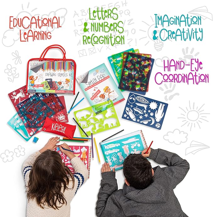- 🧳 GREAT FOR TRAVELING – Kipipol deluxe drawing set for kids comes with a convenient and durable travel bag that has 2 inner pockets and a place for each item in this kids stencil set. It’s never been easier to carry art supplies for kids with you when you travel! ideal for road trips, airplanes, trains, buses and more.