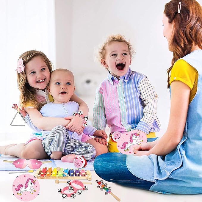 Kids Musical Instruments Sets, 12pcs Wooden Percussion Instruments Toys Tambourine Xylophone for Kids Playing Preschool Education, Early Learning Musical Toys for Boys Girls Gift (Pink)