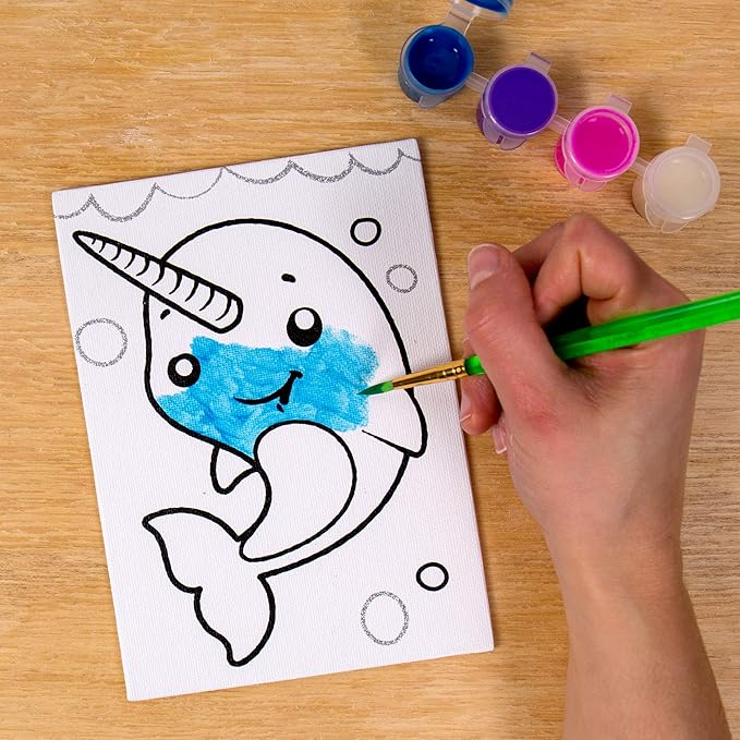 - SET INCLUDES: 3 Pre-Printed Canvases (Panda, Fox, Glitter Unicorn, 5 in. x 7 in.), 6 Assorted Triangle Easy-Grip Paintbrushes, 1 Mini Paintbrush, 12 Paint Pots of Non-Toxic Tempera Paints (5mL Each)