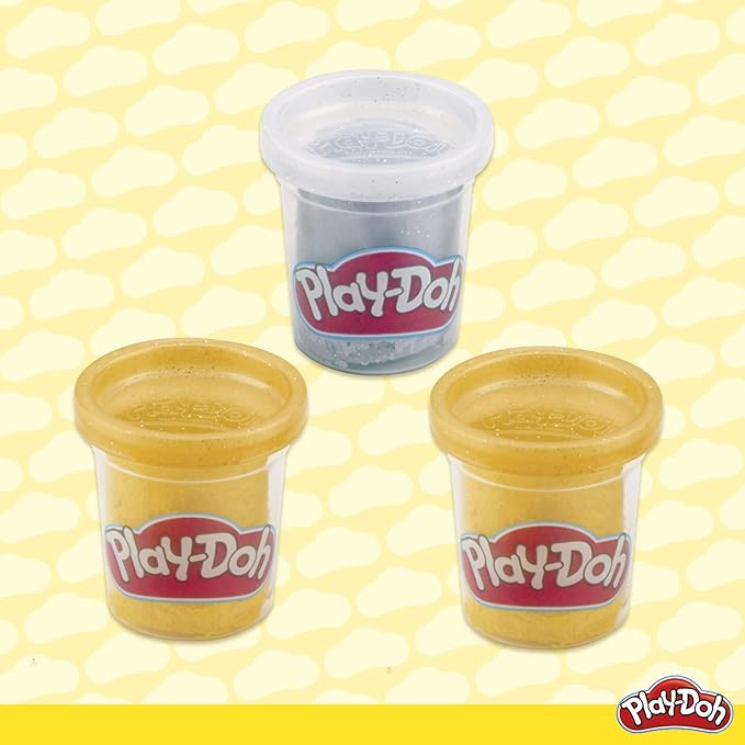 - SHIMMER AND SHINE WITH GLITTER: Shape and mold magical scenes using the 6 cans of 3-ounce Play-Doh Sparkle compound and 3 cans of 2-ounce metallic modeling compound in silver and gold