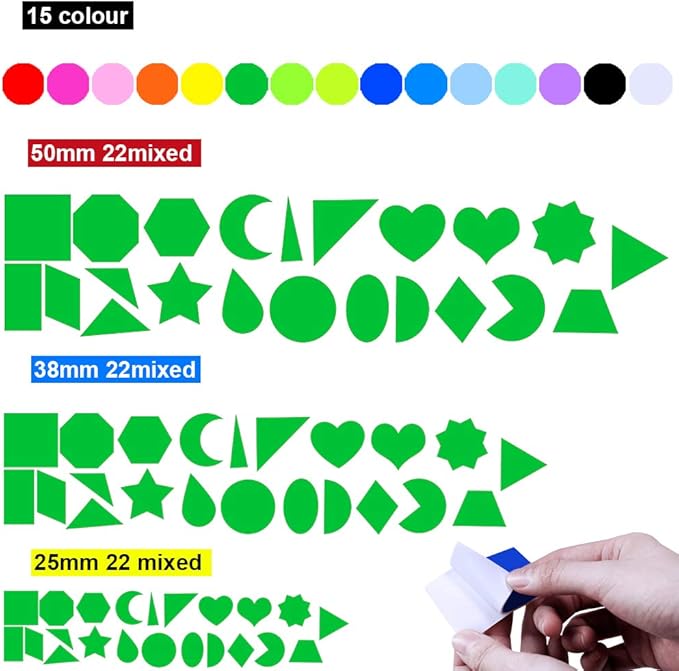 - Quantity:1035 Pcs 15 Colors 3 Sizes 22 Shape Bulk Foam Stickers Self-adhesive Foam Geometry Shapes Stickers Assortment,Including Square,Rectangle,Circle,Parallelogram, Rhombus,Kite,Trapezium, Right Triangle, Triangle, Scalene, Acute Triangle, Star, Hexagon, Octagon, Octagram, Ellipse, Semicircle, Heart, Crescent,Pic and Tear Drop Self-adhesive Foam Shape Stickers.