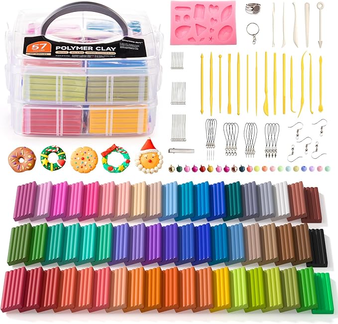 - 57 COLORS POLYMER CLAY KIT: Shuttle Art polymer clay set contains 57 colors 0.7 oz/block oven bake clay, together with 19 useful clay tools and 10 kinds of accessories. Ideal modeling clay for kids and beginners to make small ornaments, model animals, characters, etc