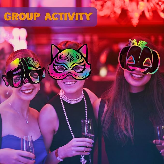 - SUPER VALUE PACK. Our Halloween scratch masks come in 32 pieces with 8 cute designs such as pumpkin, bat, vampire, pumpkin and more halloween characters.