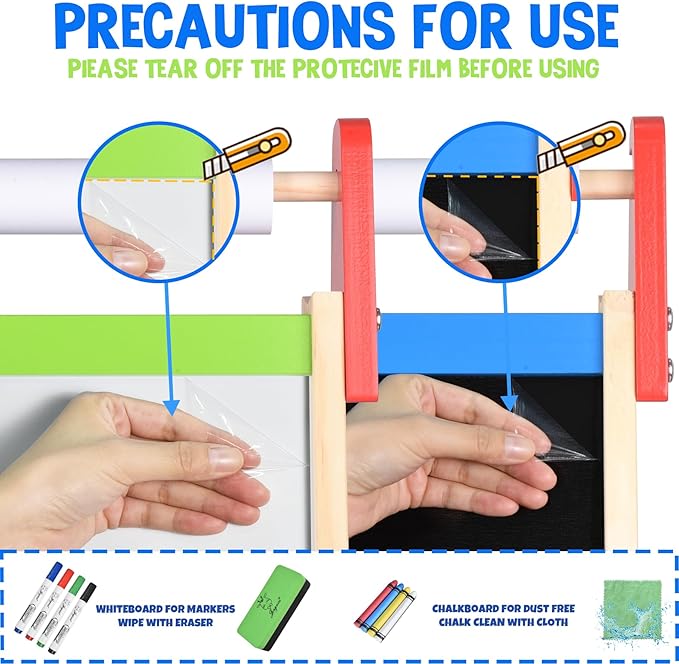 - 【DOUBLE-SIDED TODDLER EASEL】 The art easel for kids consists of two boards with dry erase board on one side and chalkboard on the other. It enables several kids to play together. Both sides of the easel is magnetic. NOTICE: Please tear off the protective film on both sides before the first use.
