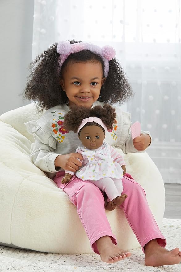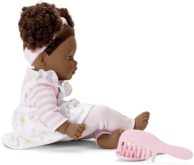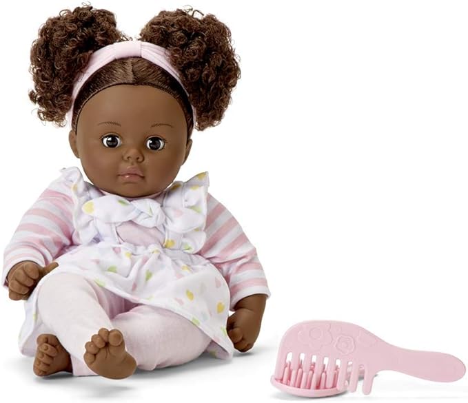 - Details: Baby’s gently smiling face has sleep eyes; Dressed in sweet polka dot pinafore, long sleeve tee, and pink leggings; Features dark skin, brunette hair, and brown eyes; Includes comb and brush; Ages 2 plus