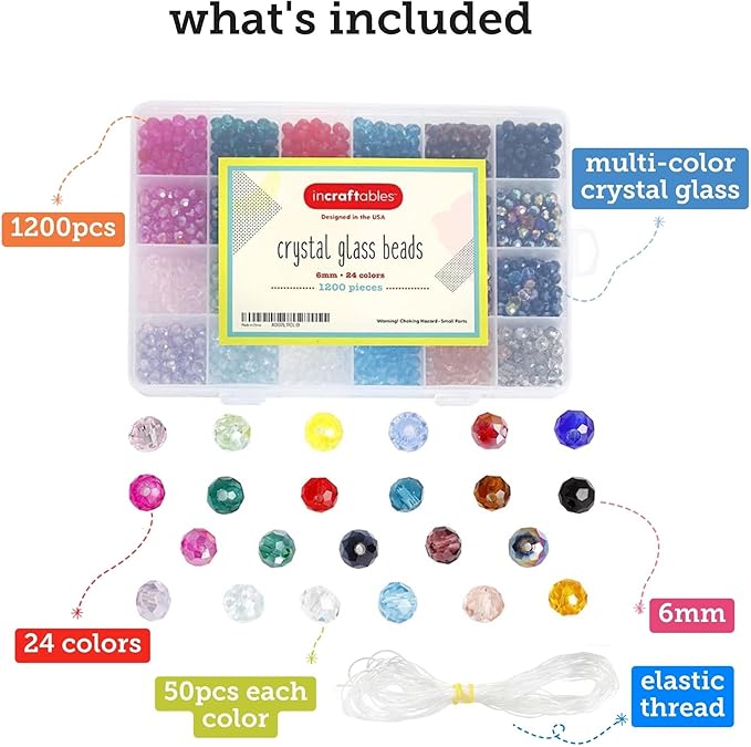 - VALUE PACK: Each package includes 1200 pcs 6 mm multi-color crystal glass (24 colors, each Color: 50pcs) craft beads and organizer box. Any size beading needle will work.