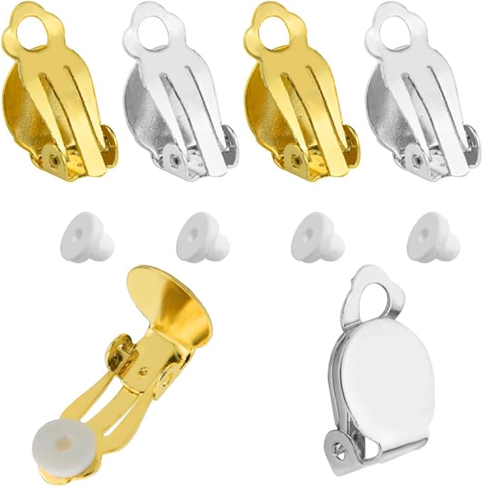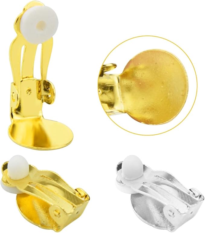- Package Include: 50 Pieces gold round flat tray earring clips, 50 pieces silver round flat tray earring clips, 100 pieces white earring pads, enough for your DIY crafts making needs.