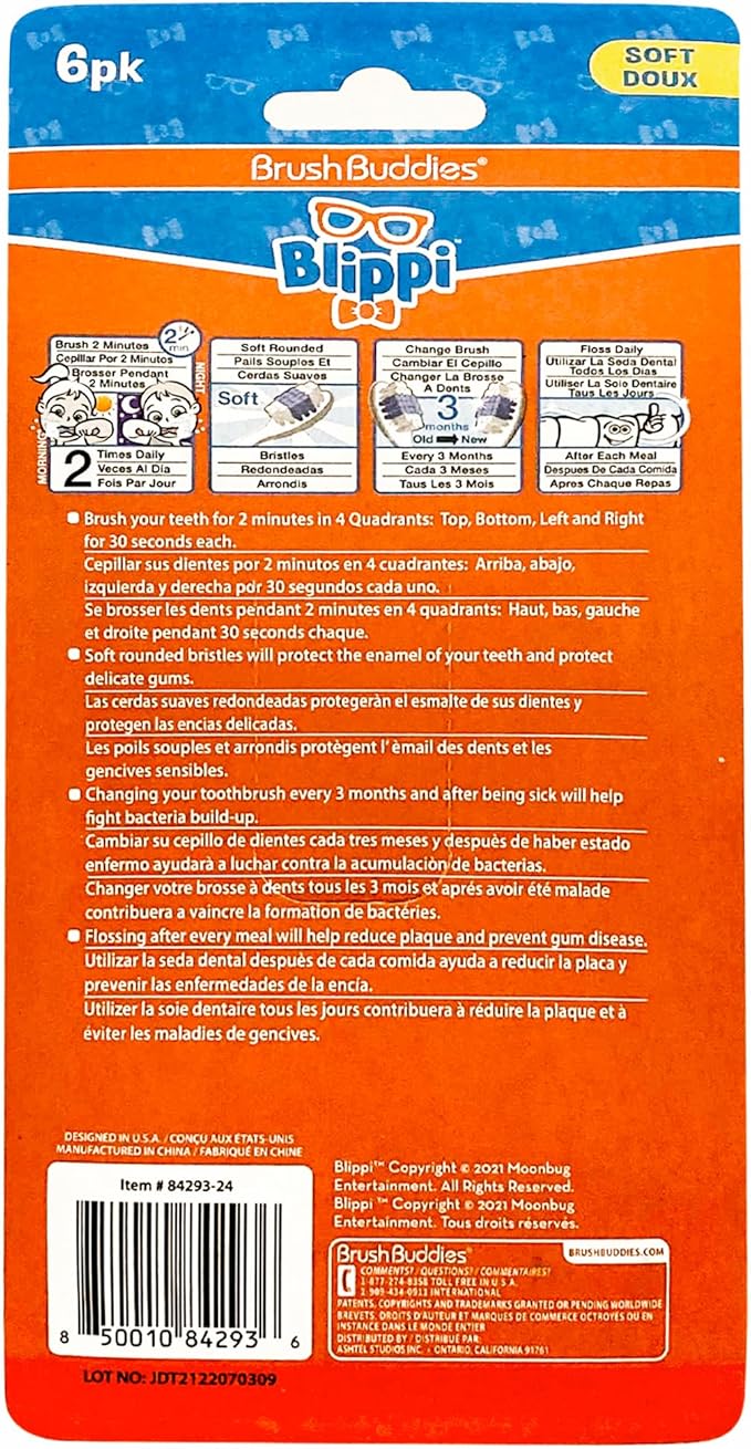 - [What's Included] The Brush Buddies Blippi Manual Toothbrush Pack includes 6 multi-colored Blippi kid's toothbrushes.