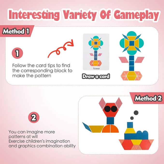 - ENCOURAGE IMAGINATION & CREATIVITY: Kids can trying to figure out what pieces make the designs on the cards and follow them to create different animals, bugs, birds and things. Also these pattern block are a effective way to training Kids imagination, improve eye-hand coordination and color & shape recognition.