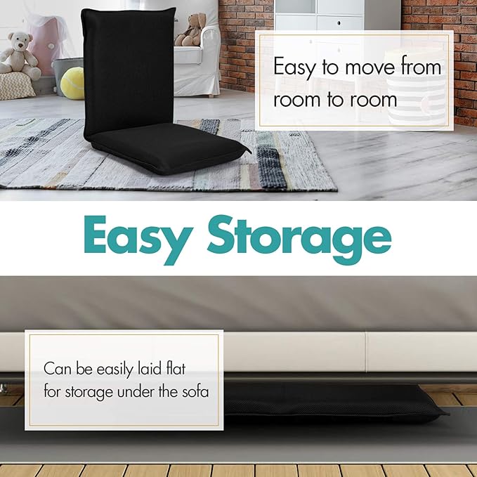 - 6-Position Adjustable Backrest—The adjustable backrest in multiple positions allows you to sit comfortably for several hours with proper posture. The straight back helps you sit upright with support. The adjustable floor chair can be laid flat, which is very suitable when your kids just want to lie down.