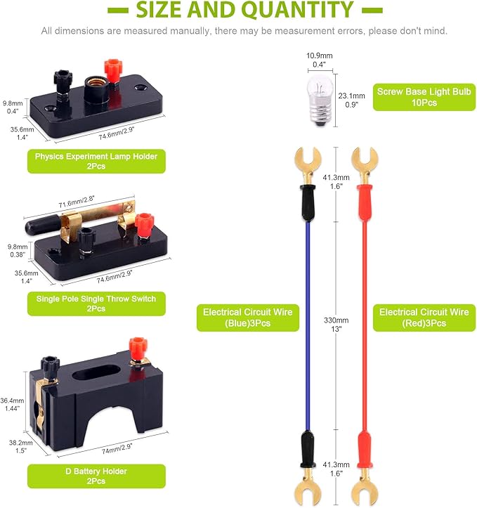 - 🚥 Perfect Physics Experiment Kit --- Including 2 E10 bulb holders, 2 single pole single throw switches, 2 sets of electricity connector wires(Blue & Red), 2 series or parallel D battery holders & 10 pieces white bulb light bulbs miniature screw base. Everything have been prepared for you except battery.