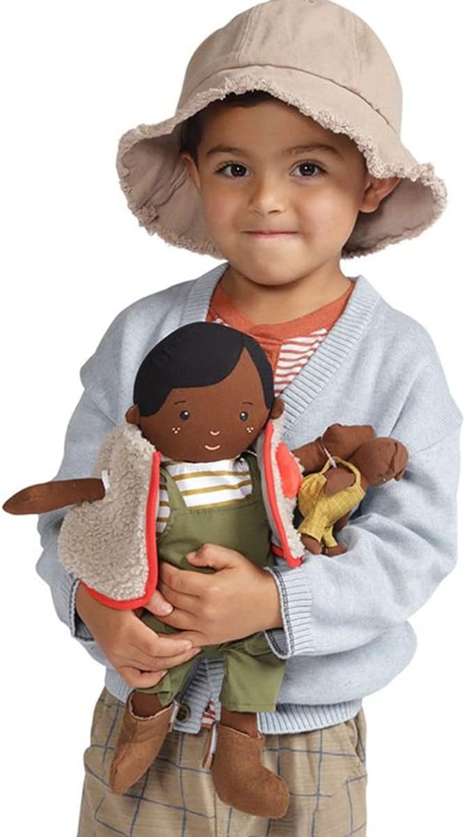 • 14 INCH SOFT DOLL: Playdate Friends Ellis measures 14 inches from head to toe, with fully embroidered facial features and sculpted, fabric hair. Ellis is wearing olive green bib-overalls, a striped undershirt with a textured fleece open vest and shoes with hook-n-loop closures.