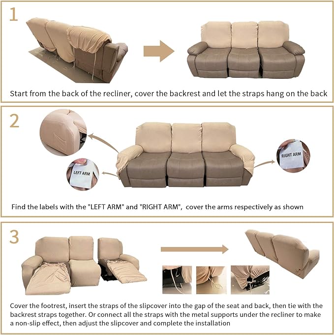 - INSTALLATION & CARE: The magical 8-piece recliner slipcovers are really effortless to put on and off. Referring to the Installation Guidance, you can finish installment in a short time by one person. The recliner sofa covers are machine washable, for good and easy maintenance better wash at cold water or below 30 degrees Celsius. Please do not bleach or iron. Using mild laundry detergents and tumble dry low or lime up