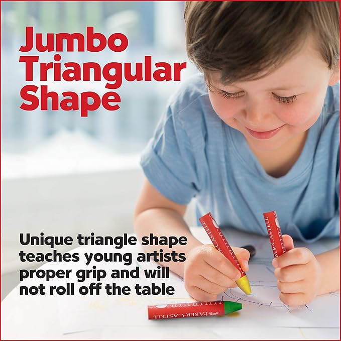 - TRIANGULAR SHAPED - Faber-Castell jumbo crayons are triangular in shape allowing for young artists to learn proper grip and prevent hand fatigue when coloring. Bonus - these triangular crayons will not roll off your school desk or workspace!