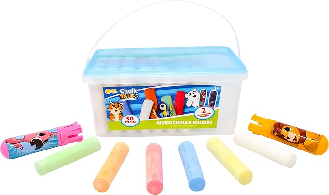 Sunny Days Entertainment Jumbo Washable Sidewalk Chalk with Holders and Storage Bucket, Mess Free Fun Kids Art Color & Patterns, Outdoor Playground, Non-Toxic, Washable Art Set (50 count)