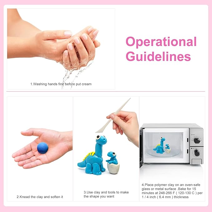 - Modeling Mode: Oven baking-set the temperature to 130°C (266°F) and bake for 10-30 minutes-recommended, hair dryer heating (suitable for small workpieces of 1-2 inches), boiling method, Don’t microwave,Instructions for safe use: Children aged 1 to 3 are prohibited from using it, and children aged 3 to 6 are recommended to use it under the supervision of an adult