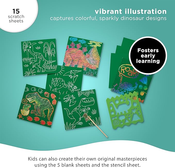 - 10 dinosaur themed sheets|5 blank sheets|1 dinosaur stencil sheet|1 wooden stylus|Age Range: 3+
