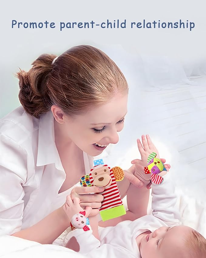 - CUTE DESIGN -- All Wrist Rattles and Foot finder socks have bells inside,the Wrists rattles attach with hook and loop, easy to put on and off. Hand shaker build in rattle & sound generator, it makes sound when shaking & pinching.