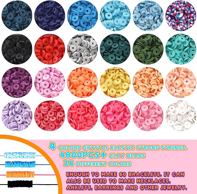 - 【HIGH QUALITY AND SAFETY】- The flat clay beads for jewelry making kit is made of high quality polymer clay, the material is environmentally friendly, non-toxic and safe, and children can use heishi beads with confidence. clay beads are brightly colored, waterproof and lightweight, skin-friendly and comfortable, and can be worn every day without fading and abrasion. This clay bracelets beads kit is exactly the quality product you are looking for.