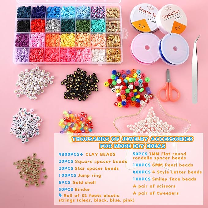 - 【VALUE CLAY BEAD KIT】: The clay beads for bracelets making kit includes 24-color flat round soft clay beads (200pcs each color), letter beads in 4 types of colors (100pcs each color), 100pcs smiley face beads, 100pcs pearl beads, 50pcs gold spacers, 20pcs square beads, 20pcs star beads, 5pcs metal conch, 20pcs lobster clasp, 100pcs jumping circle, 50pcs binders, 4 color elastic ropes, 1 small scissors,1 tweezers and 1 plastic storage box.