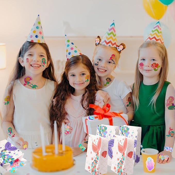 - MERMAID PARTY FAVOR INCLUDED - 12pcs mermaid gift paper bags, 12pcs mermaid slap bracelets(10 styles), 12pcs mermaid rings(6 styles), 12pcs mermaid keychains(6styles), 12pcs hair rings, 12 sheet mermaid temporary tattoos(50 styles), 30pcs mermaid stickers. Will be a great hit for kids party favors.