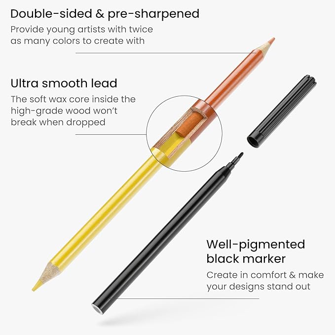 - Set Includes 12 Double-Ended Colored Pencils in 24 Colors: Our coloring book set also included colored pencils for kids, one pencil sharpener, one eraser, and one black marker.