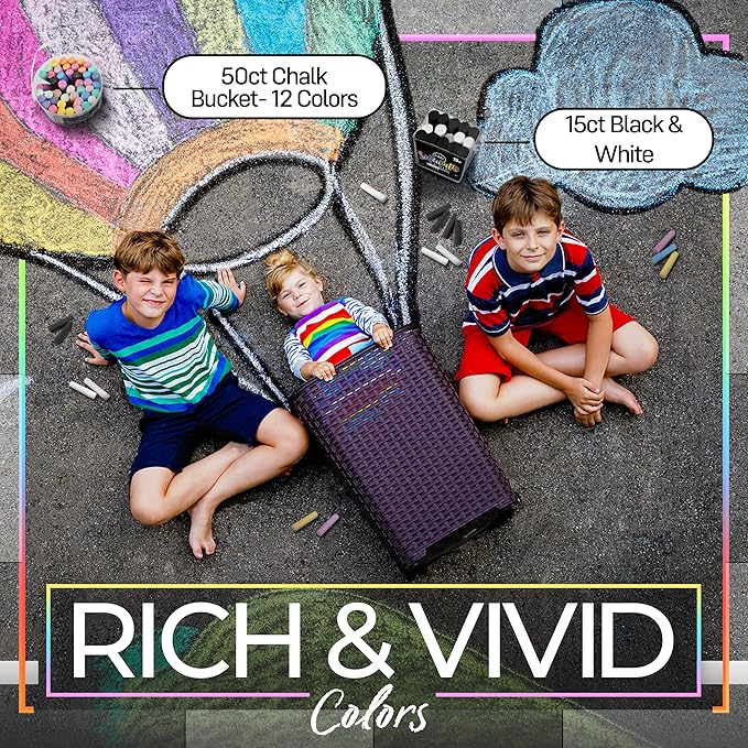 - Handy Chalk Bucket: Organize your sidewalk chalk white and black in the reusable bucket with a handle and lid. Keep your giant chalk and professional sidewalk chalk ready for your next art project, be it a snowy sidewalk scene or a colorful holiday display