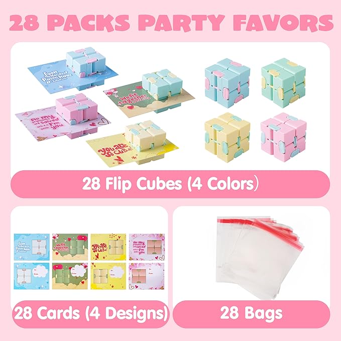 - SUPER VALUE PACK. Our Valentines’ day gift for kids includes 28pcs of Infinity Magic Toys and 28 pcs valentine’s cards with cute, humorous messages that uniquely match the Infinity Fidget toys.